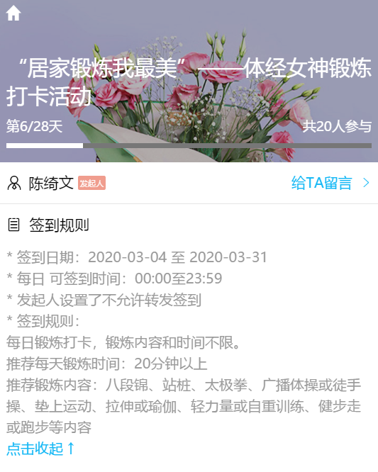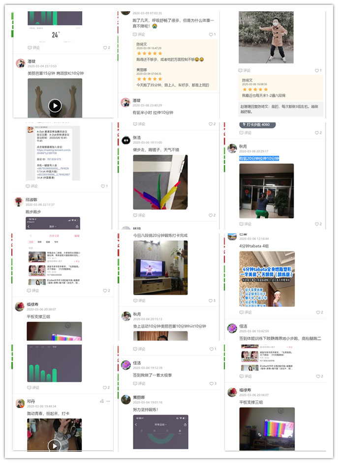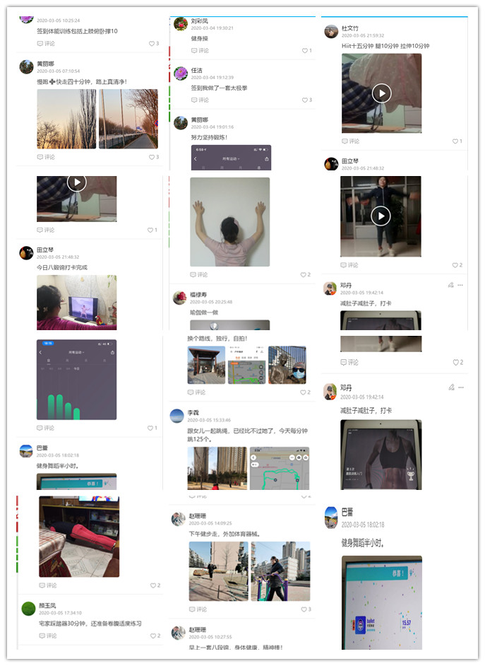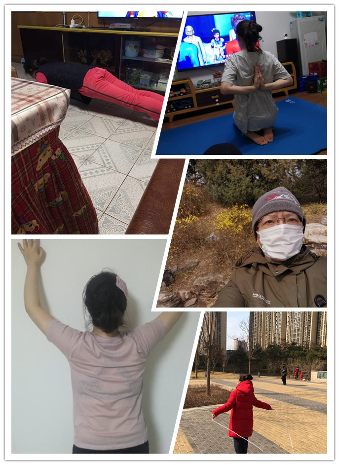 本次活动自2020年3月4日开始,新葡萄官网20(共23)名女教工人积极参与到本次活动中。大家根据自己的爱好,因地制宜,通过开展不同的运动来锻炼身体,积极打卡,传递出积极向上的精神状态。