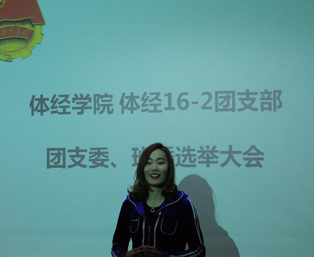 在主持人的引导下,经过出团旗等环节后,竞选正式开始。首先进行的是体经16-2团支部的团支委、班委竞选。杨文蓉同学就竞选团总支书记一职发表热情演讲,赵大为、刘姝鑫等6名同学也发表了真诚的竞选演讲,诚挚的表达出自己想为班级体服务的心声。