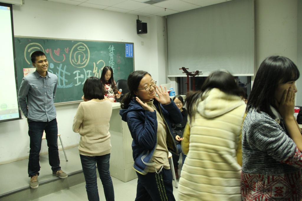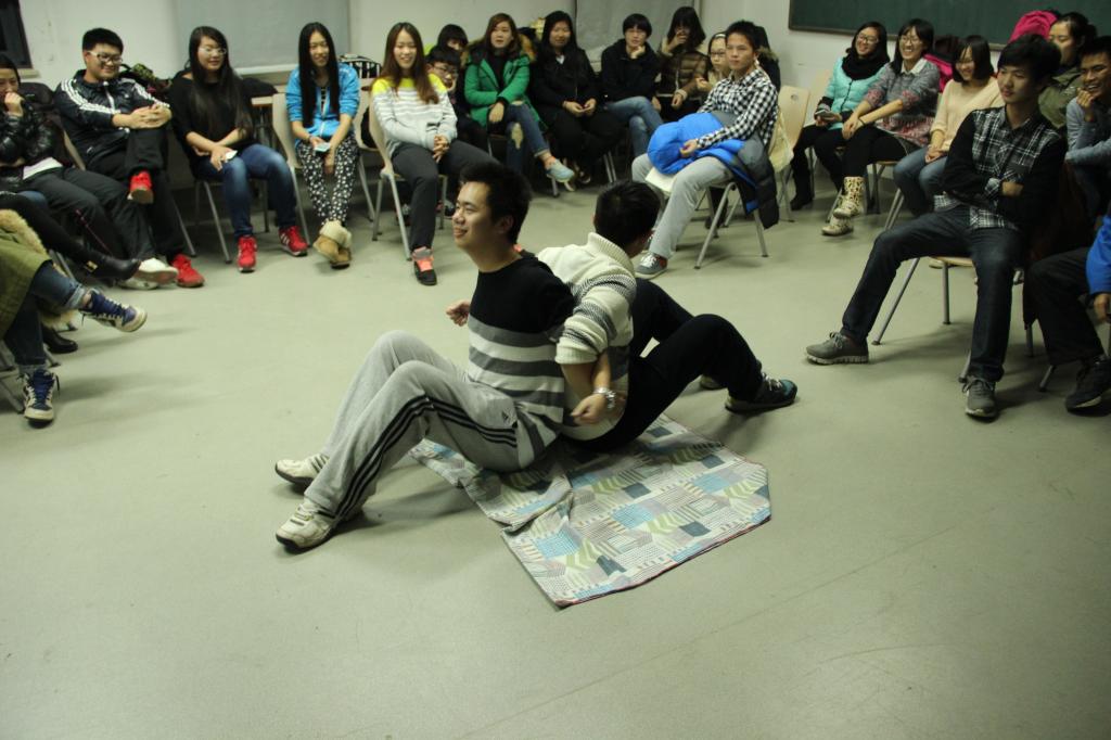 热身游戏结束后,心理委员开展了以“亲密关系与自我成长”为主题的心理小讲座,就大学生恋爱问题进行了讨论并给出了建议,赢得了同学们的掌声。在热烈的气氛中主持人又组织大家进行了“快乐传真”、“齐心协力站起来”、“疯狂猜词”三个游戏,“快乐传真”游戏更是将整场活动气氛推向了高潮。同学们通过一系列的游戏活动明白了表达的重要性和团队的意义。