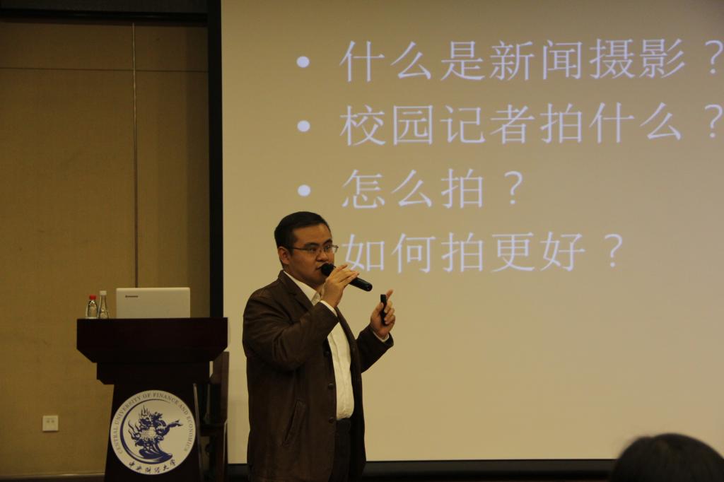 培训分为两个板块依次进行。第一板块的新闻摄影由校党委宣传部刘禹老师主讲。培训伊始,刘老师明确指出新闻摄影和摄影并不相同,“新闻摄影,拍到比拍好更重要”刘老师说道,“新闻摄影关键在新闻意识、新闻主题,构图和稀性。”紧接着,刘禹老师从校园新闻摄影“拍什么”,“怎么拍更好”两个方面细致的讲解了在会议、活动、舞台以及合影等常见拍摄场景的拍摄要点、构图技巧以及注意事项。