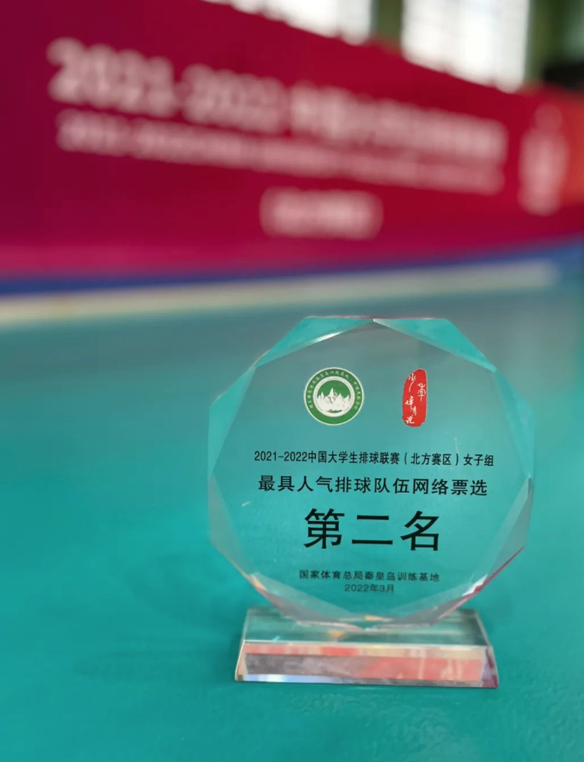 我财女排还被评为2021-2022中国大学生排球联赛(北方赛区)女子组最具人气排球队伍网络票选第二名
