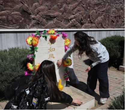 仪式现场,两名学生代表敬献了花篮,全体人员面向纪念碑行三鞠躬礼。随后师生分组为烈士墓碑拂尘扫灰、敬献鲜花。墓碑上金黄滚烫的名字引发学子们深深的哀悼之情,他们用生命守护的,正是我们今天脚下的土地。